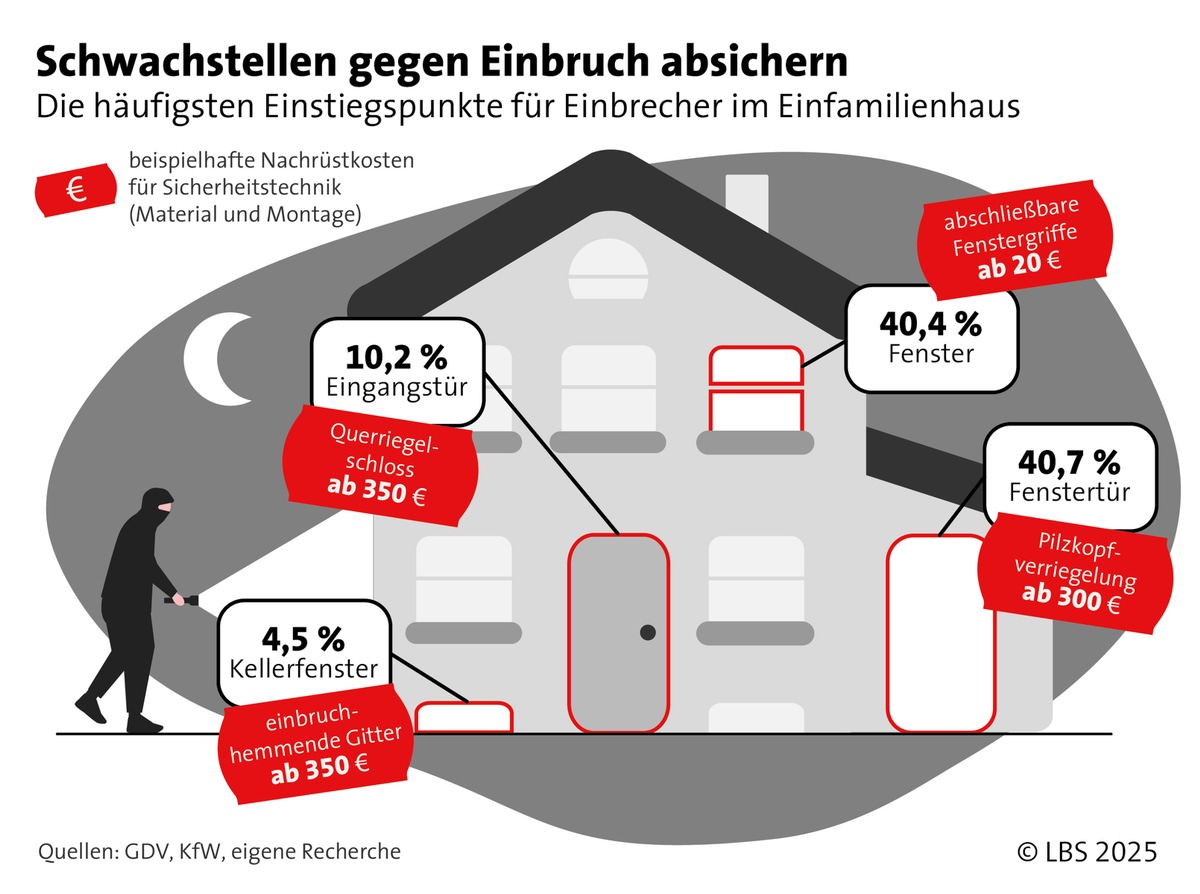 Bei der Auswahl der richtigen Produkte und Maßnahmen gibt es Rat bei Polizei und Fachbetrieben. Die Finanzierung einbruchhemmender Maßnahmen wird von der Kreditanstalt für Wiederaufbau (KfW) über das Programm "Altersgerecht Umbauen (159)" mit zinsgünstigen Krediten bis zu 50.000 Euro unterstützt. Gefördert werden einbruchhemmende Türen, Fenster, Rollläden, Nachrüstsysteme und Alarmanlagen, auch in Verbindung mit Smart-Home-Technologien. "Gut geeignet für eine Finanzierung sind auch die Modernisierungskredite der Landesbausparkassen, die unkompliziert, flexibel und planbar sind", so der ergänzende Tipp von Tilman Sanner von der LBS.